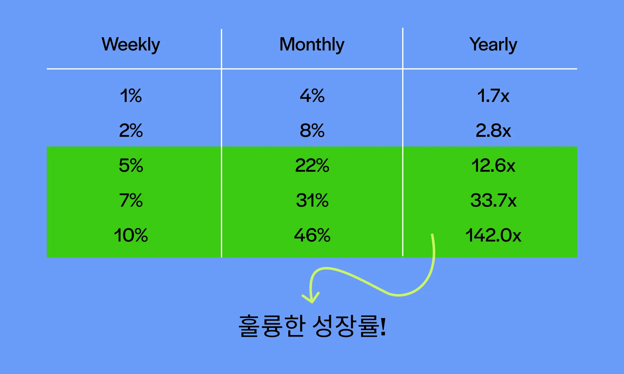 Ycombinator에서는 매주 7% 성장을 하면 빠르게 성장하는 스타트업이라고 정의한다.