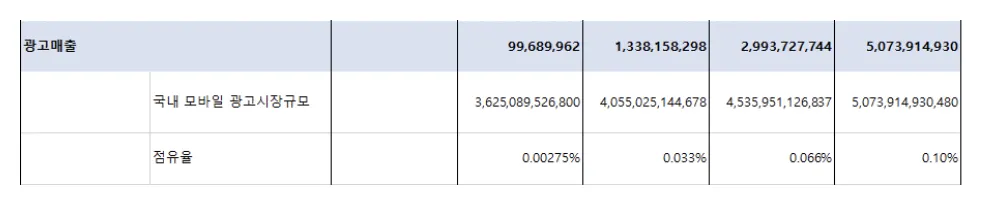 또한 광고단가의 경우 유저가 증가할수록 단가가 올라갈 수밖에 없어요.그 부분은 유사한 플랫폼 업체(네이버, 구글, 카카오)의 공시자료 등을 살펴보면 간접적으로 알 수 있기도 합니다.