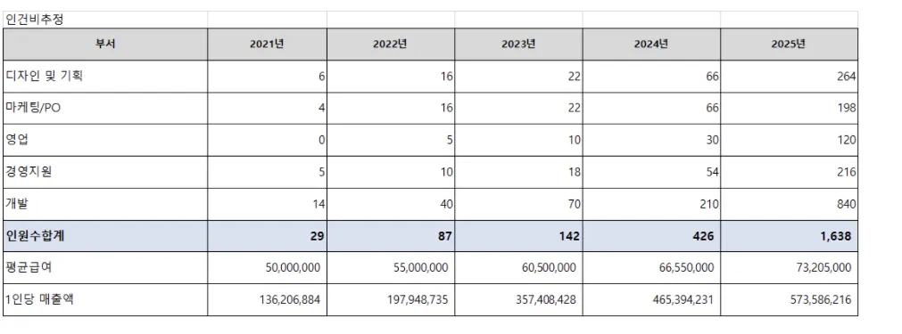 근데 보통 스타트업 사업계획을 보면 막 1인당 매출액이 15억씩 나오고 그런 경우도 많습니다. 특별한 근거가 없는 한 그런 형태는 거의 불가능하죠아무리 잘 나와도 1인당 매출액 4~5억을 매우 초과하는 것은 비현실적인 가정이라고 볼 수 있습니다.