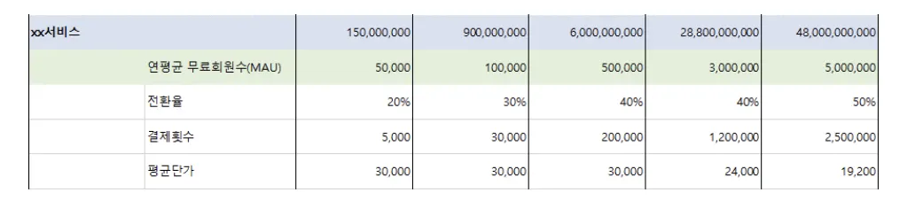 기본적으로 스타트업의 사업계획은 최소 5년은 되어야 합니다. 그래야 기업 미래에 성공했을 때의 잠재력을 가늠할 수 있기 때문입니다.그리고 앞으로 뭘 할지 구체적으로 계획을 세워야 그것을 숫자로 표현하는 것이 가능합니다.예를 들면 이런 식이죠