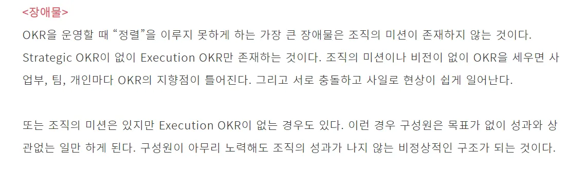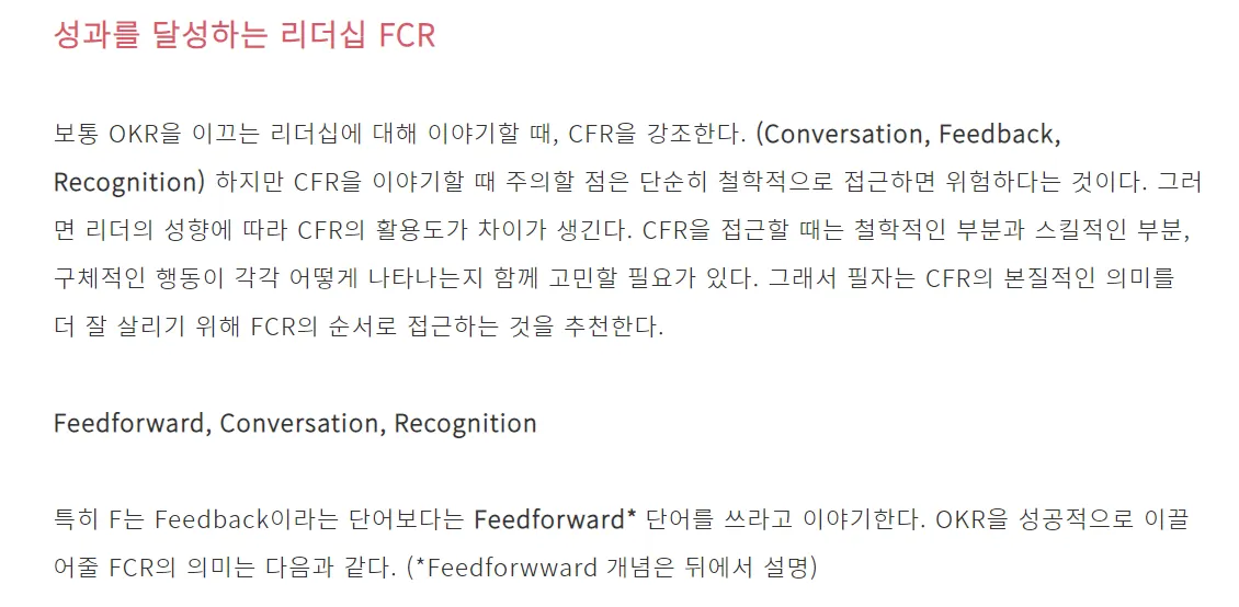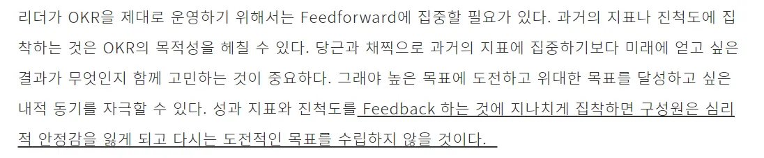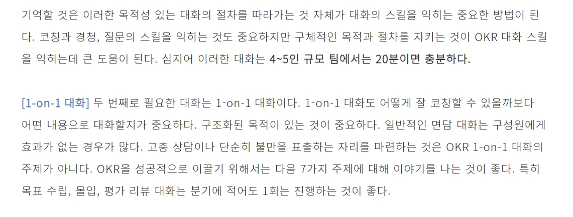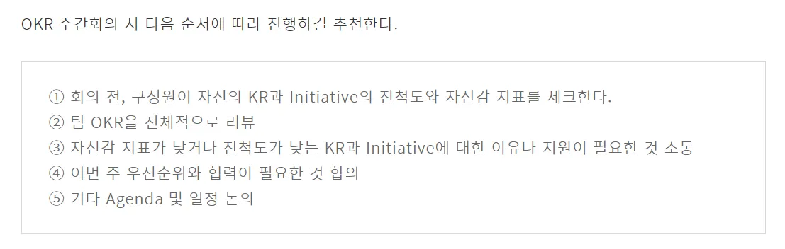 구성원이 OKR을 매주 혹은 매일 Check - in, 이것을 위해 업무 시간 할당.