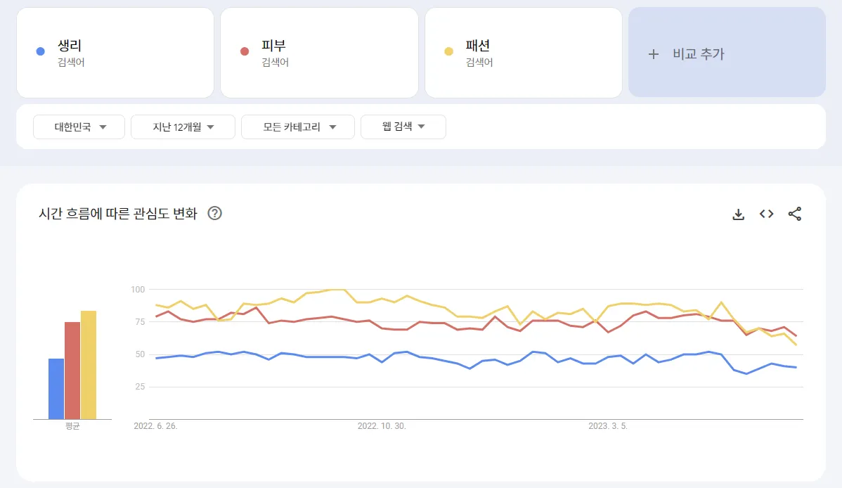 니즈의 성장과 콘텐츠의 다양화 : 이미 버티컬 커머스가 성장한 ‘피부’나 ‘패션’같은 키워드에 비해 여성 한정인 점을 감안했을 때, 지엽적인 키워드인 점을 감안했을 때, 밀리지 않는 키워드 트래픽을 보면 니즈와 관심이 보인다