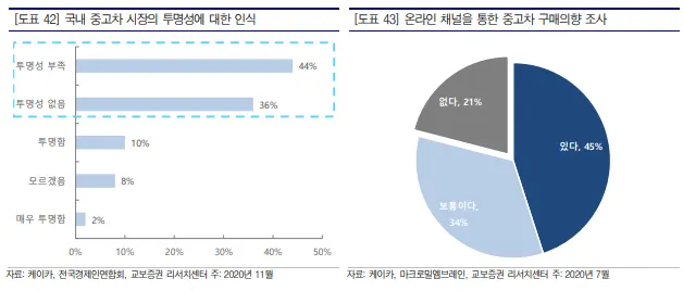 미국 컨설팅사 Frost & Sullivan에 따르면, 2020년 기준 *국내 중고차 시장은 39조원 수준으로, 신차 58.4조원 다음으로 가장 큰 규모의 소비 품목이다. 다만 온라인으로 소비되는 중고차 비중은 1~2%에 불과한데, 이는 대표적인 저침투 품목인 식품(21%) 대비해서도 극도의 저침투품목이다. 온라인 중고차 시장은 가파르게 성장할 것으로 전망한다. 1)증고차는 온라인 저침투 품목으로서 소비의 온라인 전환과 궤를 같이하며, 2)온라인 채널이 중고차 시장의 성숙화를 주도할 것이기 때문이다.