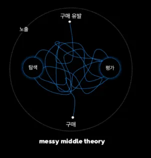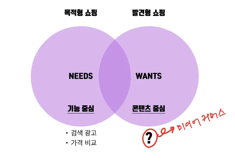 보통 목적형 쇼핑에서는 기능 중심으로 끊임없이 탐색과 평가를 아래 오른쪽이 그림처럼 계속 진행되며, 검색 광고나 가격 비교를 중심으로 이루어진다. 그리고 발견형 쇼핑에서는 일상 콘텐츠 중심으로 끊임없는 노출을 통해 구매 유발이 되고, 다양한 콘텐츠 중심의 복잡한 의사결정이 지속된다.