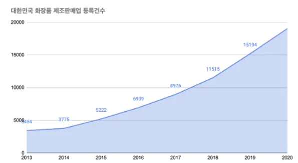 그래프를 보면 미친 듯이 생겨났다는 것이 보여짐. 2020년에는 식약처에 등록된 화장품 제조판매업 등록건수는 총 1만 9천여개.