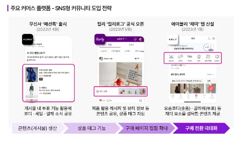 콘텐츠와 커뮤니티 기능을 중심으로 하되 커머스가 추가된 형태로 구성함.