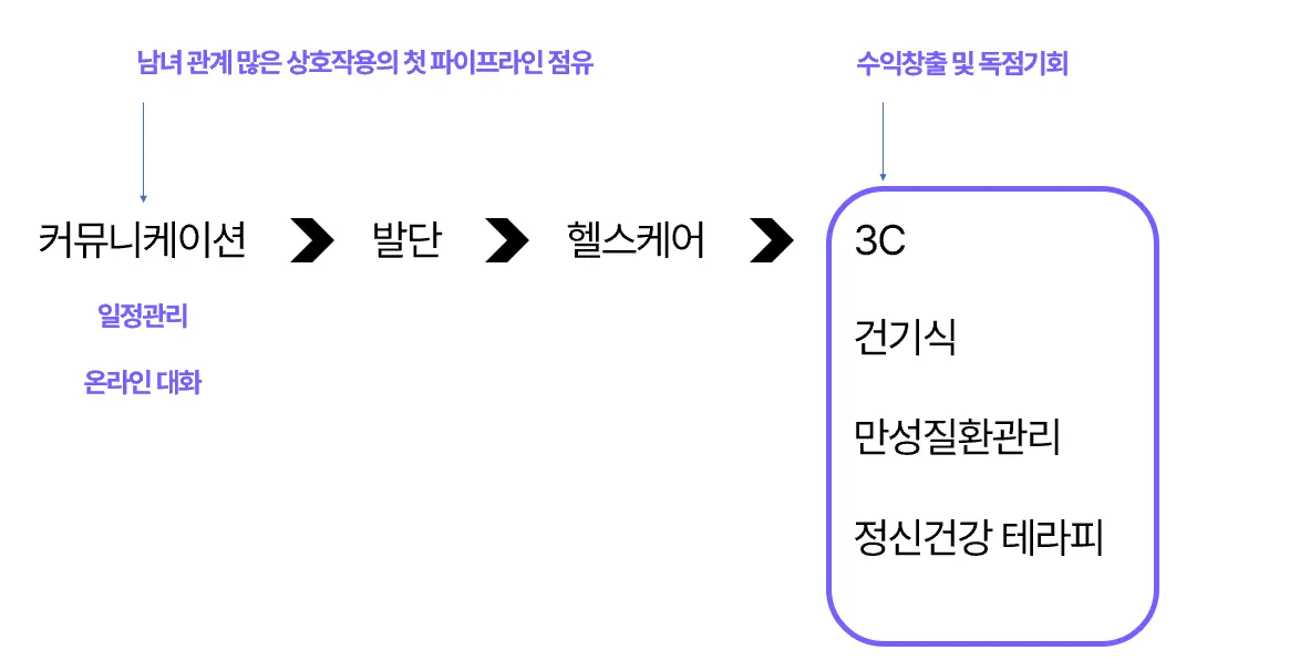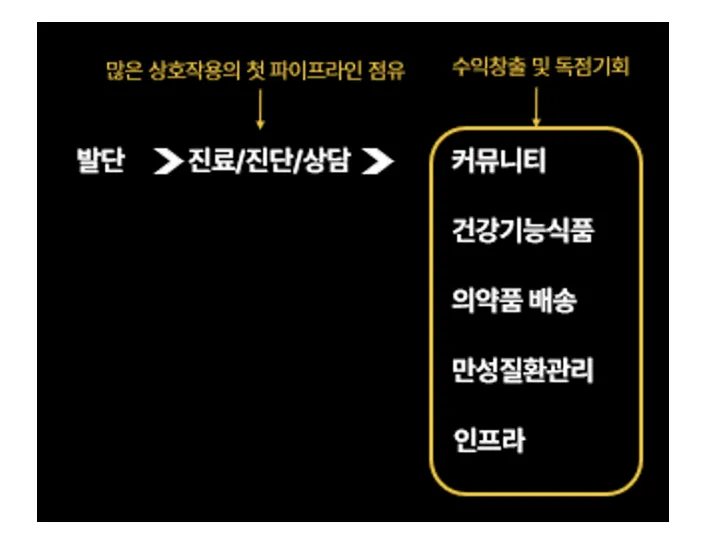 바로 왼쪽의 논리처럼, 헬스케어에 있어 많은 상호작용의 첫 파이프라인은 당연히 진료/진단/상담이고, 이 파이프라인을 점유하여 다양한 BM으로 뻗어나갈 수 있는 독점의 기회를 보겠다는 것이었죠.