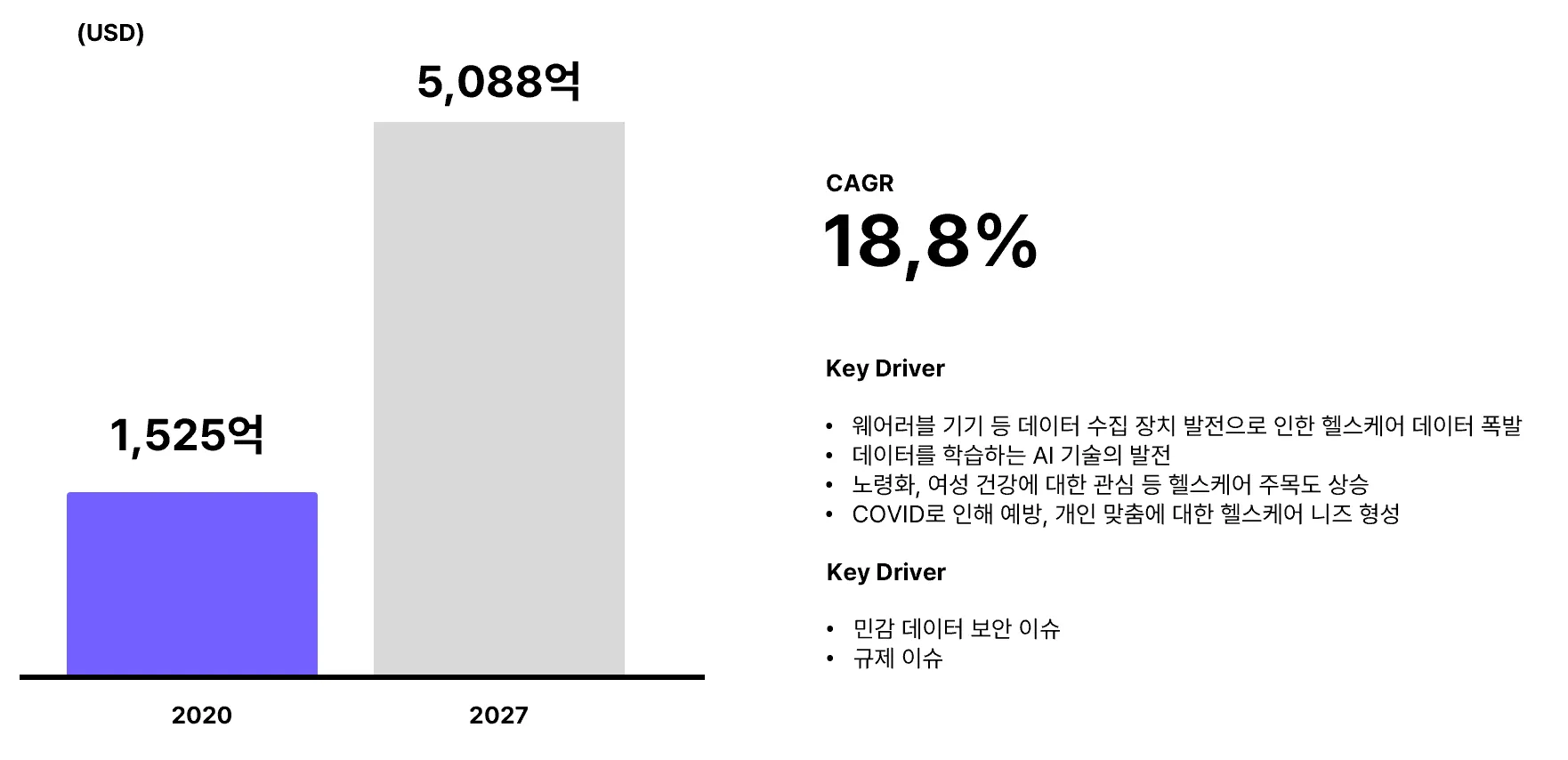 2021년 4월까지 기준 누적투자금액 100억원 이상 스타트업 291개 중 헬스케어 스타트업은, 29개로 높은 비중을 차지하고 있는 것만 보아도 알 수 있습니다. 그만큼 이 시장이 미래의 우리 삶을 획기적으로 바꾸고, 큰 돈을 벌어다 줄 것이라고 믿는 이들이 국내외적으로 이렇게나 많다는 말이죠.