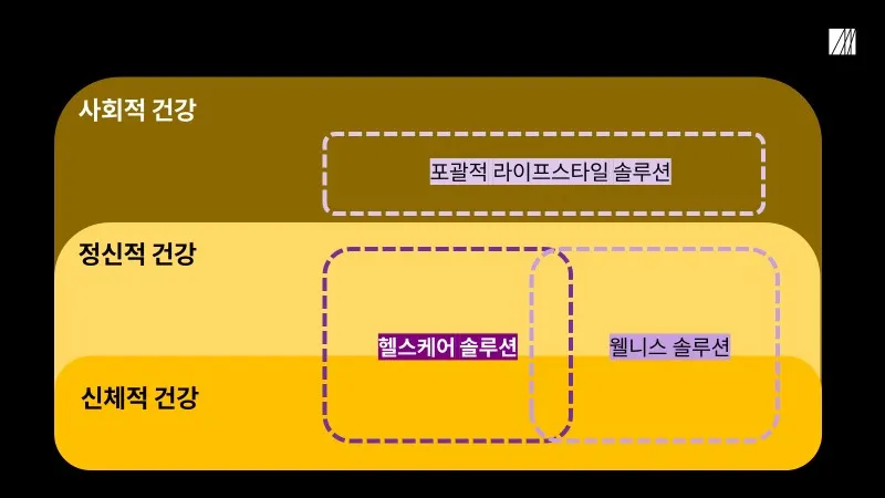 아래 도표 중, 신체적 건강의 영역에서, 헬스케어 솔루션과 웰니스 솔루션만을 한정하겠습니다.