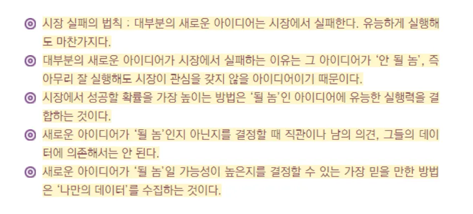 그리고 이 책은 시장에서 가장 값싸게 심판받는 법을 아주 자세히 가이드해주는데, 5WHYS를 통해서 우리가 생각하는 강력한 아이디어들을 모아 놓고, 이 방법론들을 통해 여러가지 평가와 시장의 심판을 받아야 하는 과정을 진행했으면 좋겠다. 결국에 이 과정을 제대로 하지 못하고 우왕좌왕하기 때문에 데이터로 다들 설득이 안된다고 생각한다. 서로 느끼고 있는 확신점과 받아들인 인풋들을 그대로 쉐어링하기란 불가능하고, 보고 있는 시장의 관점이 다르니까. 결국에는 5WHYS도 그걸 수행하는 사람마다 생각이 다르고, 실제 “그들의 데이터”가 아닌 “나만의 데이터”로 다른 이들을 설득시킬 수가 없다. 여기에서 나만의 데이터라고 하는 것은 이 프로덕트가 실제로 어느 수치만큼 시장에서 성공 가능성이 있는지, 시뮬레이션 된 데이터를 가리킨다.