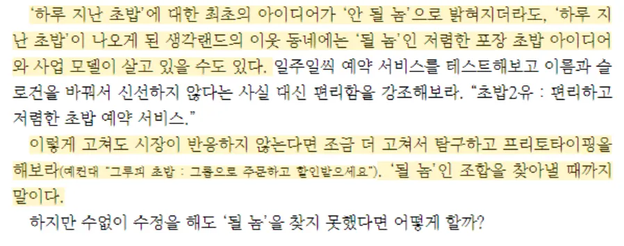 아이디어의 첫 번째 버전은 안 될 놈이었어도 몇 군데만 손보면 될 놈이 될지도 모른다, 그러니 테스트하고, 고치고, 반복하라.