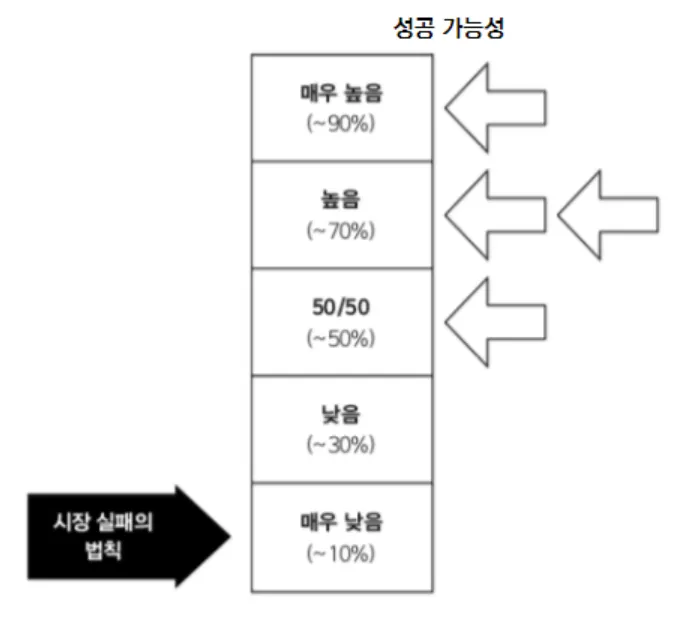 그리고 이 책에서 시장 실패란 신제품에 투자했지만 시장 결과가 기대애 미치지 못하거나 기대와 상반된 것을 뜻한다. 무언가를 시작하기 전에 자신의 성공 기준을 명확하게 세워두는 게 중요하다. 과연 시장 성공과 실패를 어떻게 정의하고 갈 것인가. 예를 들어 어느 영화가 비평가들의 찬사를 받았지만 흥행에 실패했다면 여전히 시장 실패다. 시장 실패를 한 제품이라도, 다른 기준에서는 성공으로 여겨질 수 있다.