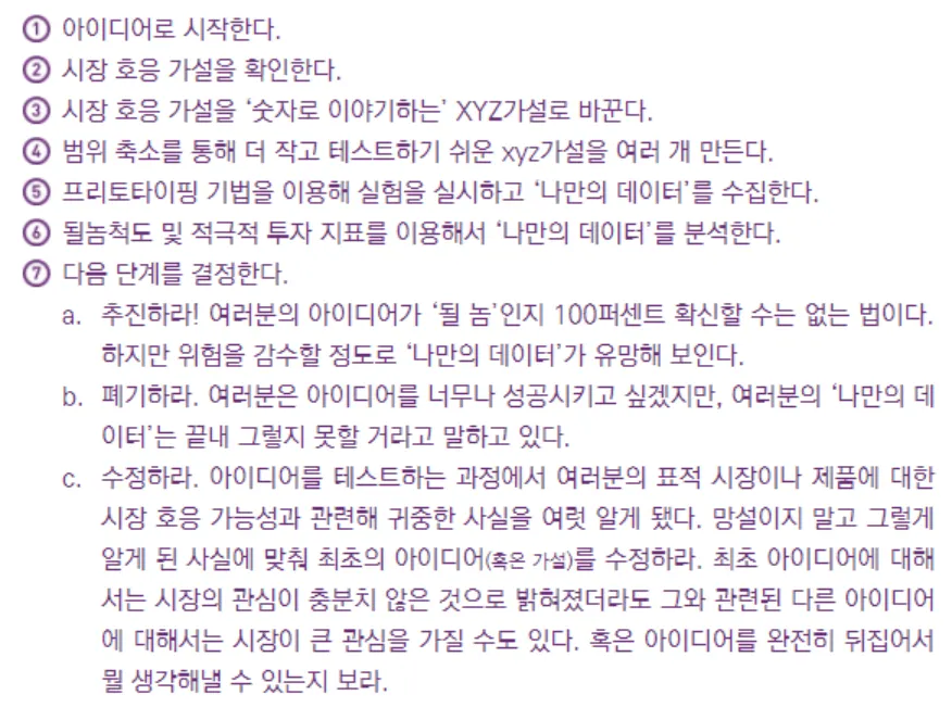 시장 호응 가설은 반드시 필요한 출발점이기는 하지만, 보통 너무 막연해서 사용할 수가 없다. 우리는 숫자로 이야기 해야 한다. 적어도 X퍼센트의 Y는 Z할 것이다 라는 형식을 이용해서 애매모호한 시장 호응 가설을 명료한 XYZ가설로 바꾸어야 한다.