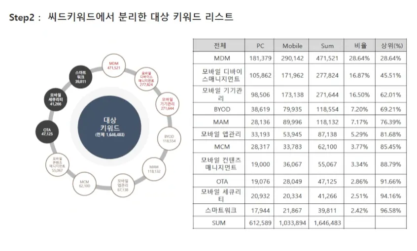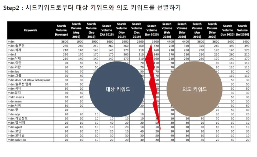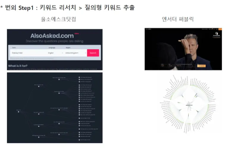 연관 검색어 → 네트워크 그래핑(다시 검색어에 넣고, 다시 검색창에 넣고, 연관검색어를 넣고 등) → 검색어 볼륨이 어떻게 줄어드는지 → 콘텐츠 가이드 뽑아냄