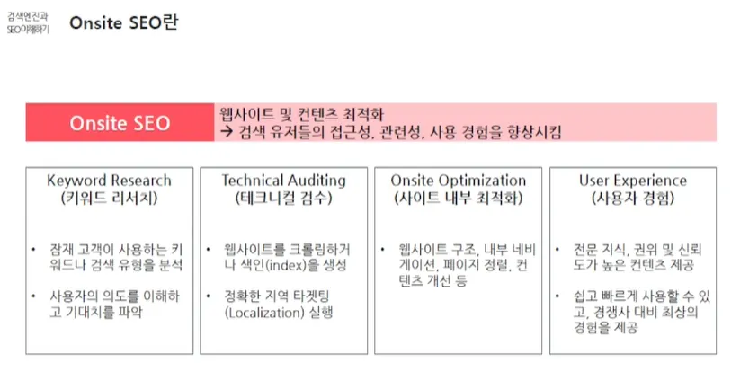 검색의도에 맞게 웹을 최적화하여 검색 결과 페이지에서 노출을 늘리는 것.