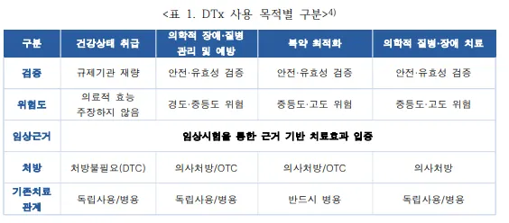 우리가 평소에 그냥 약도 처방약이 있고, 약국에 가면 살 수 있는 약이 있듯이, 디지털 치료제의 유형도 4가지 정도의 카테고리가 있다.