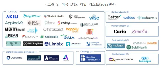 Akili Interactive(2022년 SPAC): 액션 비디오 게임을 통해 ADHD 아동을 위한 주의력 치료를 제공하는 DTx를 개발. 최근 정통 처방형에서 OTC로 전환함