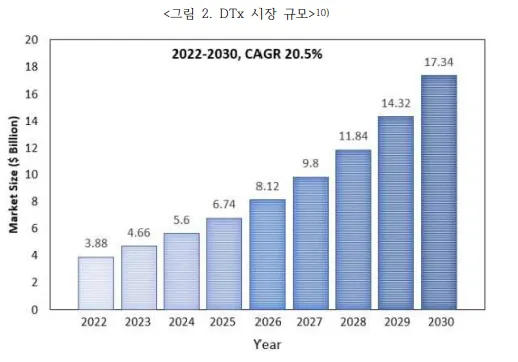 173.4억 달러에 이를 것으로 예상되며, 20년부터 2030년까지 20.5%의 CAGR을 기록할 것으로 예상된다.8) 웨어러블 기기와 센서 등의 반도체 기술의 발전과 스마트폰 및 태블릿 사용 증가, 만성 질환의 발병 증가, 의료비 절감의 필요성 증대9)와 함께 헬스케어의 디지털화가 진행되고 있고, 그에 따라 글로벌 DTx 시장이 급격히 성장하고 있다.