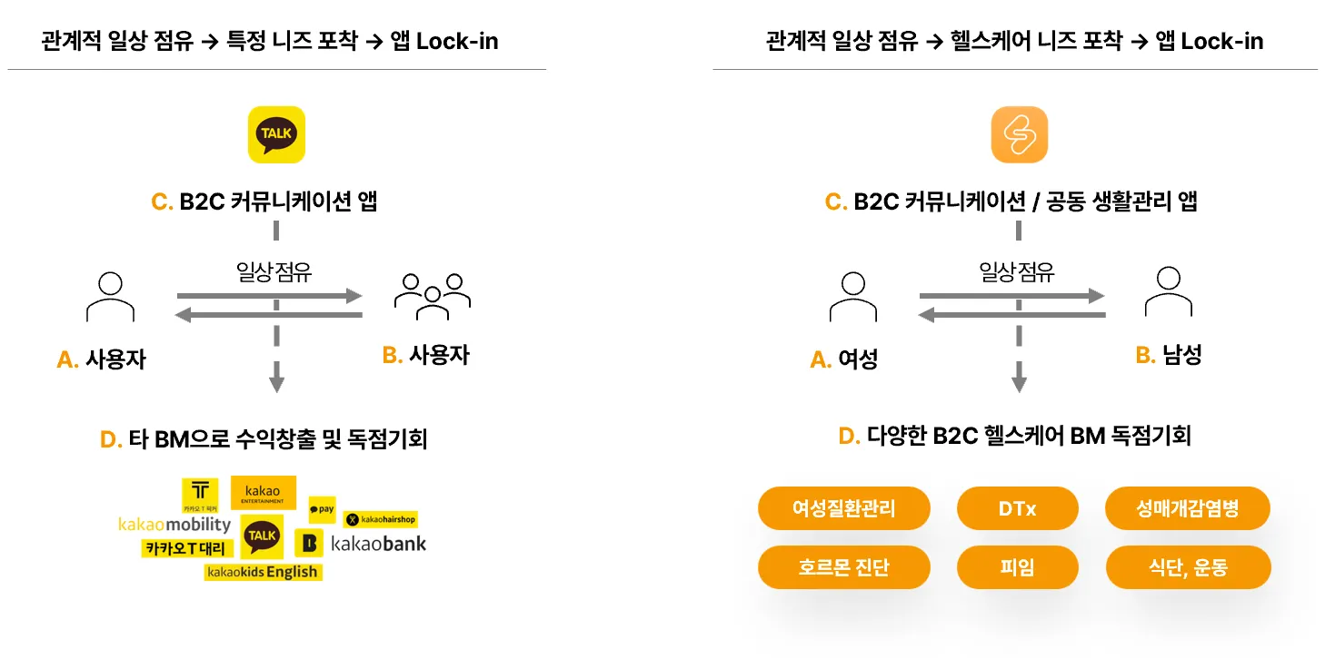 이 애정관계의 일상인 커뮤니케이션을 잡으면, 우린 자연스레 관계형 헬스케어를 독점할 수 있는 기회가 생긴다고 생각합니다. 마치 카카오톡처럼요.