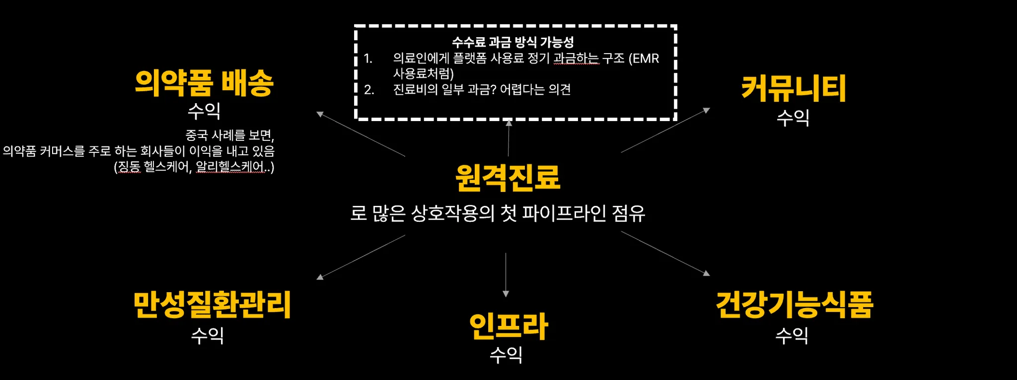 반드시 의료는 의사와 만나고 나서가 시작이기 때문에, 진료가 시작되는 시작점인 의사 - 환자 관계 파이프라인을 가장 먼저 잡는 것이 유리한 핵심이다. 많은 원격의료 플랫폼들이 슈퍼앱을 꿈꾸는 이유.