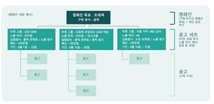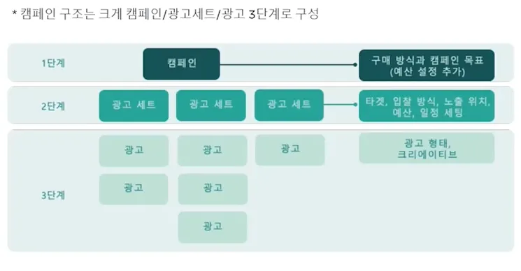 캠페인 구조는 크게 캠페인, 광고세트, 광고 3단계로 구성
