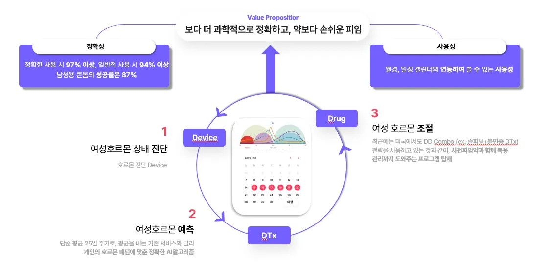 디지털 피임약은 기본적으로 여성 호르몬 패턴 데이터를 학습하여 가장 정확한 주기를 예측해주는 진단 AI라고 분류할 수 있다.