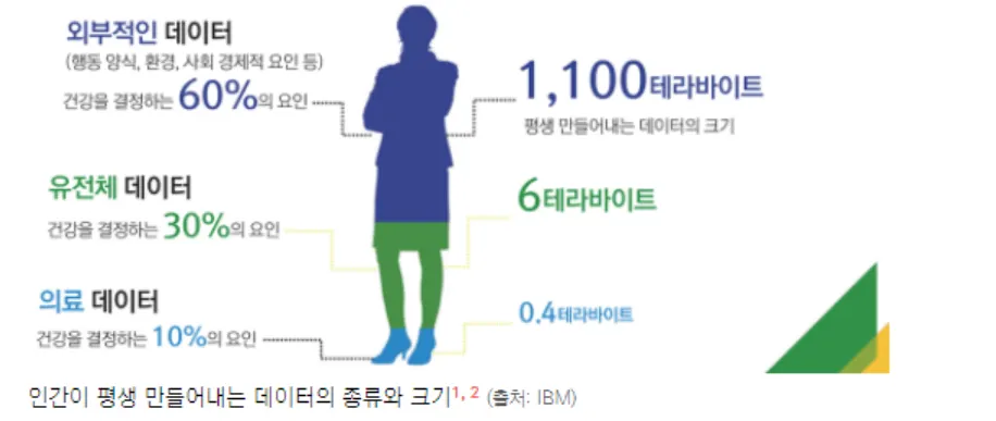 그 와중에 인간은 그 자체로 데이터인데, 우리 인간은 크게 세가지 종류의 데이터를 만들어낸다. 의료 데이터, 유전체 데이터, 그리고 그밖의 외부적인 데이터이다.